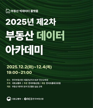 한국부동산원(원장 손태락)이 내달 2일부터 4일까지 한국부동산원 서울강남지사에서 ‘2025년 제2차 부동산 데이터 아카데미’를 개최한다고 26일 밝혔다.부동산 데이터 아카데미는 양질의 부동산 데이터를 개방하고 부동산 신산업 육성을 지원하기 위한 국토교통부 ‘부동산 빅데이터 플랫폼 운영 사업’ 프롭테크 지원 프로그램의 하나로 추진된다.민관 협업을 통해 구축된 부동산 빅데이터 플랫폼에서는 현재 부동산 개발ㆍ공급ㆍ거래ㆍ관리, 수익형 부동산 관련 데이터 265종과 ‘모빌리티 데이터 기반 주거지역 소음지도 서비스’ 등 공익 목적의 데이터 활