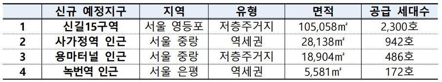 저층주거지인 신길15구역과 용마터널 인근은 각각 10만5,058㎡와 1만8,904㎡ 면적에 2,300호, 486호를 공급할 예정이다. 역세권인 사가정역 인근은 2만8,138㎡ 면적을 개발해 942호를 공급하고, 녹번역 인근은 5,581㎡에 172호를 공급할 계획이다.