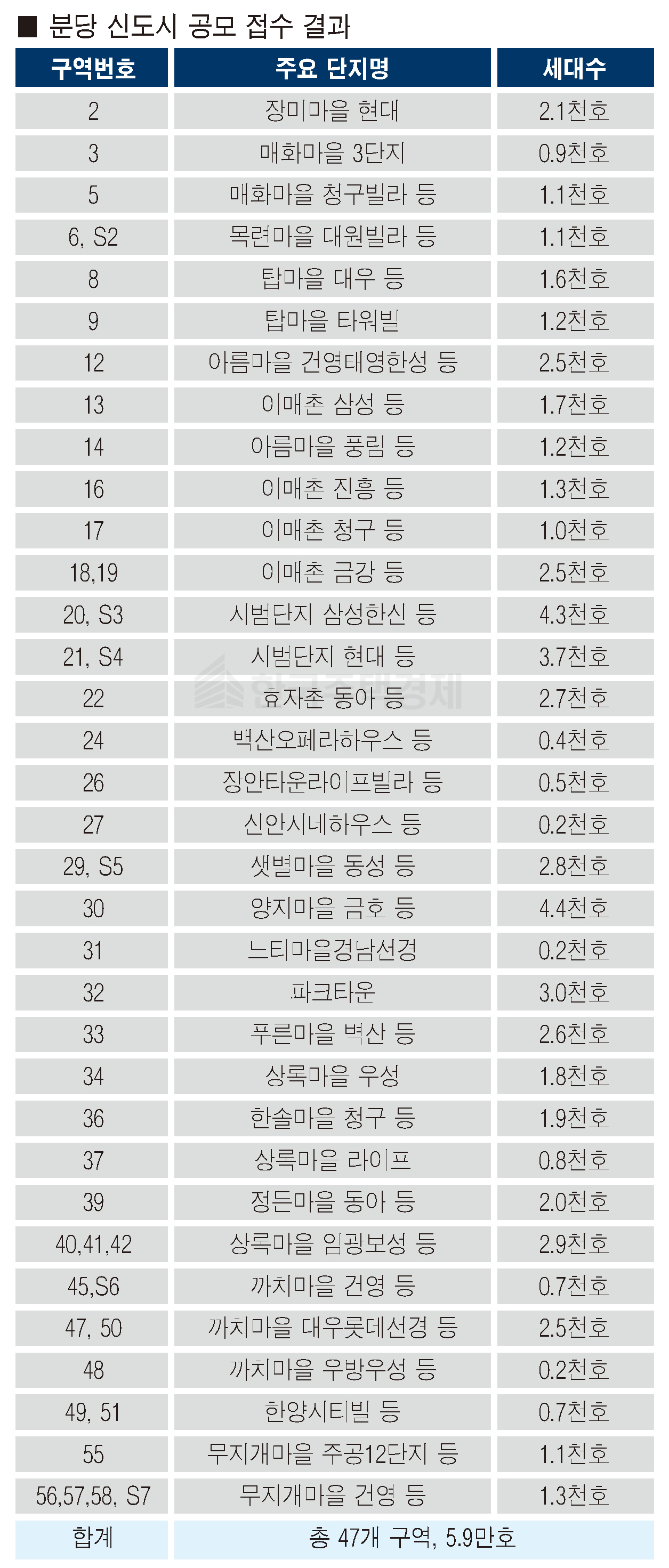 먼저 분당 신도시의 경우 선도지구 공모 대상인 특별정비예정구역 67곳 세대 규모가 큰 양지마을, 시범단지삼성한신 등 중 47곳이 참여했다. 선정 규모 8,000세대(최대 1만2,000세대) 대비 7.4배인 총 5만9,000세대로 제출된 구역들의 평균 동의율은 90.7% 수준이다.
