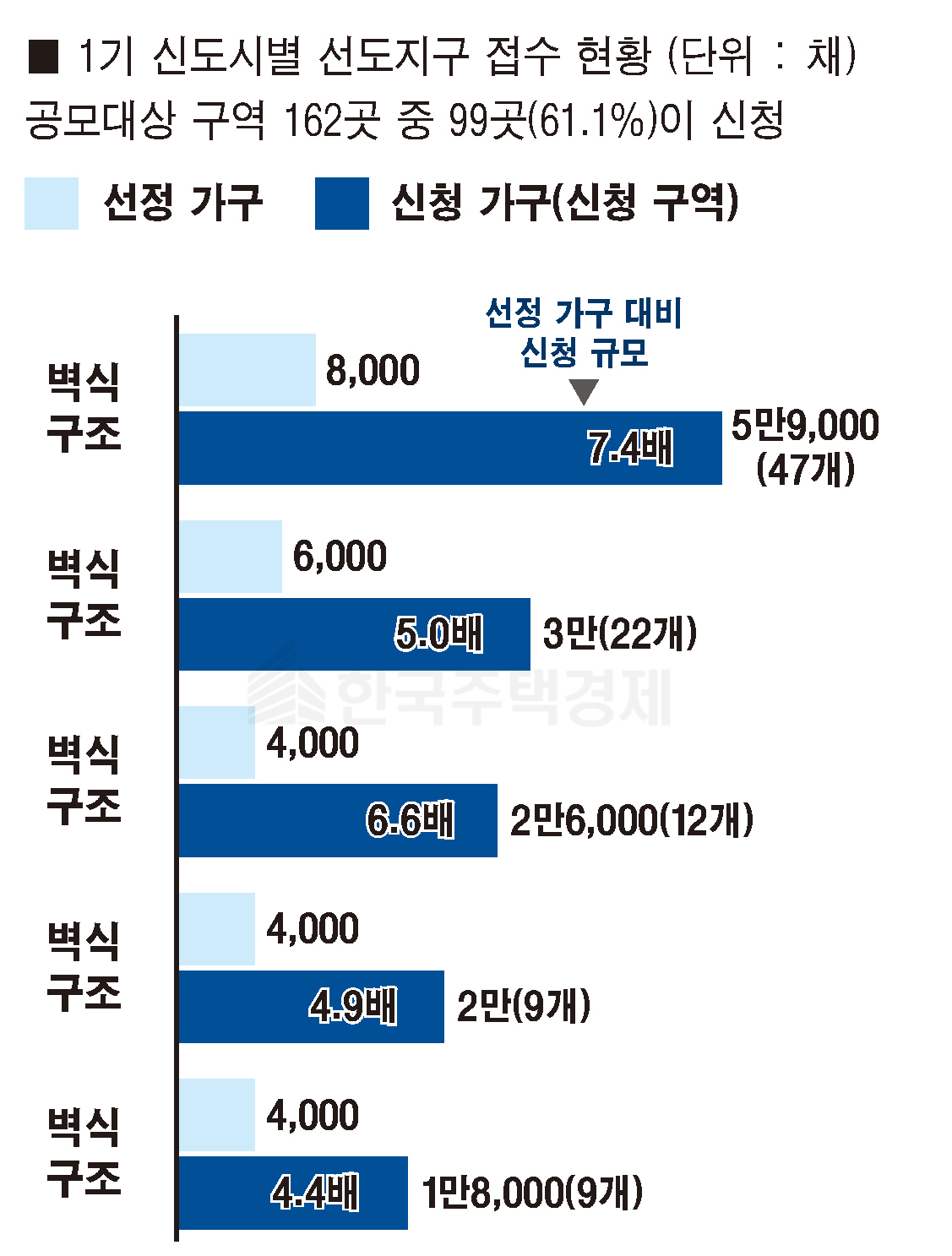 국토교통부가 지난 29일 발표한 자료에 따르면 1기 신도시 정비 선도지구 선정 공모에 제안서를 제출한 구역은 총 99개 구역이다. 이는 선정 총 규모인 2만6,000세대(최대 3만9,000세대) 대비 5.9배인 총 15만3,000세대로 집계됐다. 분당 47곳, 일산 22곳, 평촌 9곳, 중동 12곳, 산본 9곳이 신청했다.