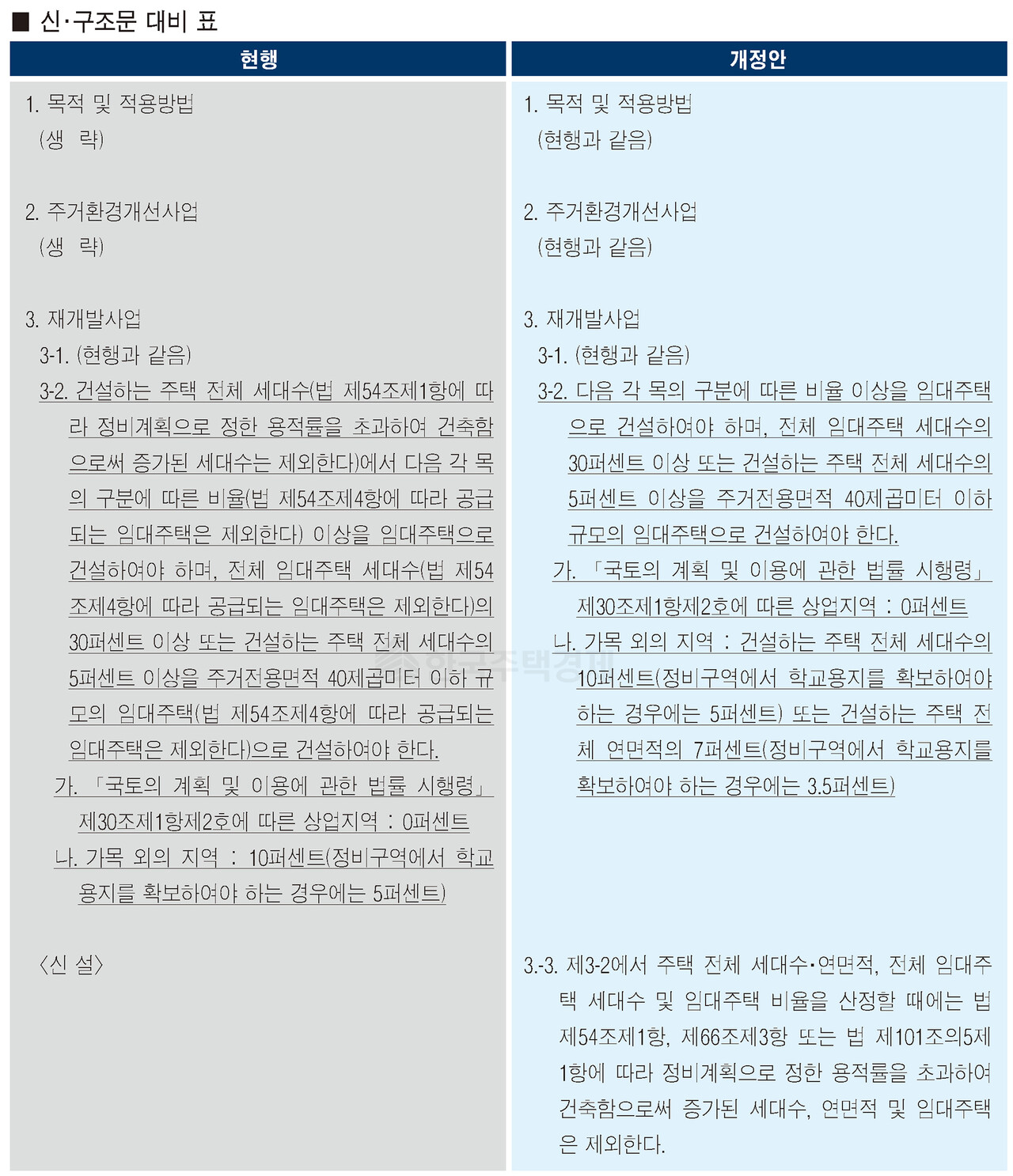 아울러 전체 세대수·연면적, 전체 임대주택 세대수 및 임대주택 비율을 산정할 때는 정비계획으로 정한 용적률을 초과해 건축함으로써 증가된 세대수, 연면적 및 임대주택은 제외된다.