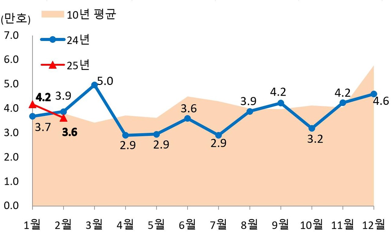 우선 수도권 인허가는 7.003호로 전년도 동월(8,916호) 대비 21.5%가 감소했지만, 2월 누적 실적은 2만2,131호로 전년 동기 대비 11.3%가 증가했다. 특히 서울지역의 경우 인허가 물량이 4,844호로 전년 동월 2,451호 대비 약 98%가 증가했고, 누적 실적 역시 전년 동기(4,952호)보다 54%가 늘었다. 반면 비수도권은 4,449호로 전년 동월(3,510호)과 2월 누적실적(전년 2만8,839호) 모두 감소한 것으로 조사됐다.