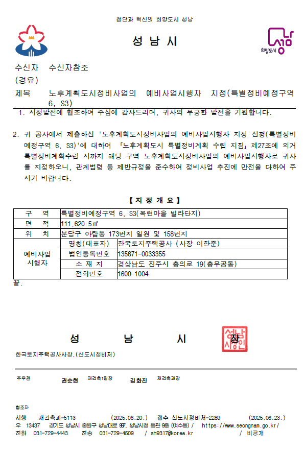 LH 관계자도 “공공시행 방식의 이점을 최대한 활용해 내년 초 특별정비구역 지정·고시가 이뤄질 수 있도록 행정적, 기술적 지원에 최선을 다하겠다”고 말했다.