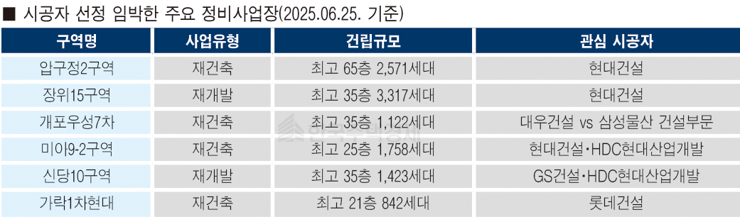 대신 삼성물산 건설부문은 강남구 개포우성7차에서 대우건설과 뜨거운 승부를 펼친다. HDC현대산업개발, GS건설, 롯데건설 등도 각각 강북구 미아9-2구역, 중구 신당10구역, 송파구 가락현대1차의 유력 시공자로 거론되고 있다(2025.06.25. 기준).
