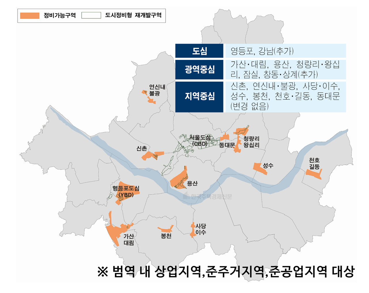 변경안에 따라 지역별로 △도심지역 영등포, 강남(추가) △광역중심지역 가산·대림, 용산, 청량리·왕십리, 잠실(추가), 창동·상계(추가) △지역중심지역 신촌, 연신내·불광, 사당·이수, 성수, 봉천, 천호·길동, 동대문 등으로 구분했다.