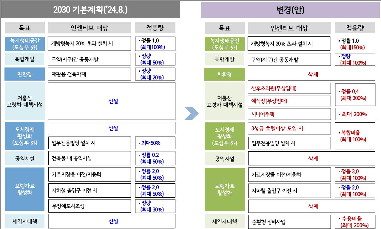 허용용적률 상향에 맞춰 도심부 외 지역에서 개방형녹지를 조성할 경우 부여하던 용적률 인센티브를 기존 최대값 100%에서 150%까지 높인다. 저출산·고령화 대책시설인 산후조리원 및 예식장 도입 인센티브 최대 200%, 정비사업 내 주거·산업세입자 대책 수립에 따른 인센티브 최대 200%도 신설한다.